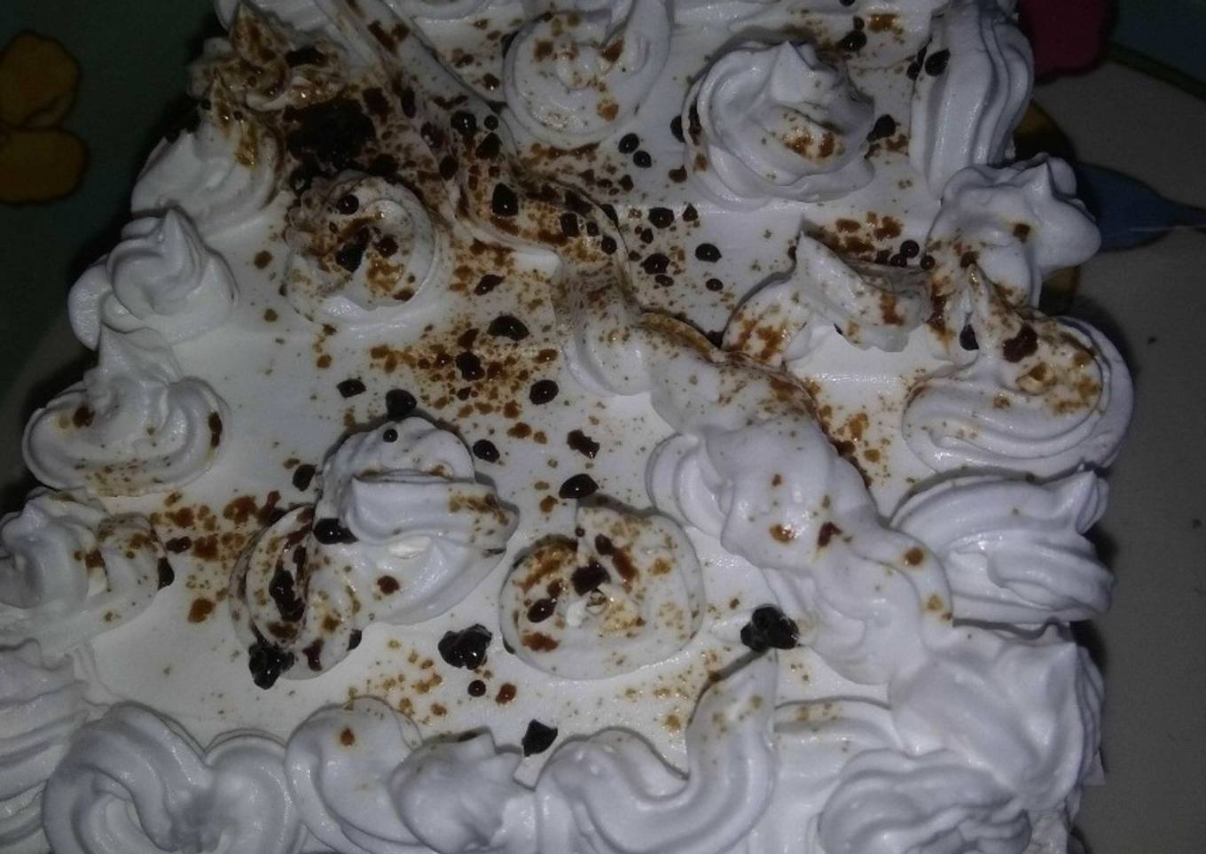 Place a cake tin mould.pour the buiscuit chocolate mixture in it and spread it evenly using a spatula. - Pour the chocolate cream mixture over it and spread it evenly using the spatula and cover the cake with the whipped cream.