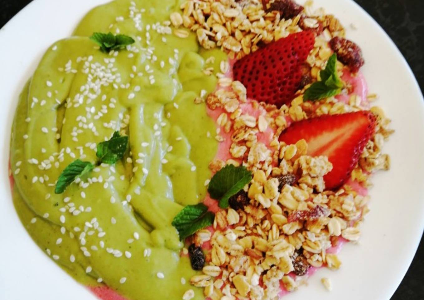- Place the raspberry mixture in your bowl, add the avocado mixture on the side. Add the granola.